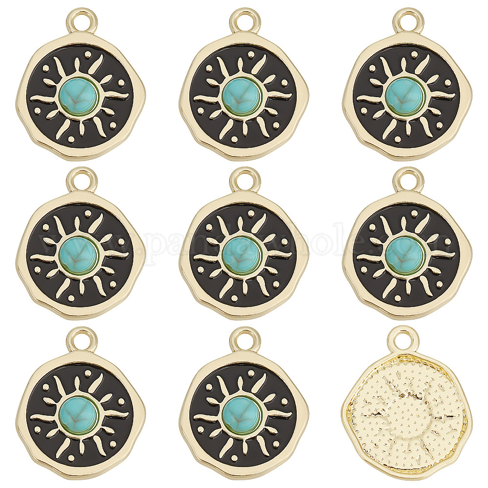 • Черный Стойки обшивки сплава эмали подвески, с синтетическими бирюзовый, без кадмия, без никеля и без свинца, золотой свет, плоские круглые с солнцем, чёрные, 22x17x4 мм, отверстие : 2 мм, 25 шт / коробка