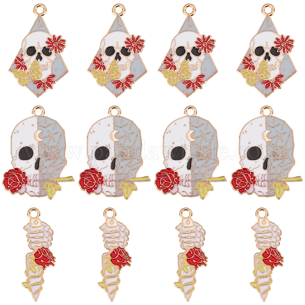 30шт 3 стиль хэллоуин подвески из сплава эмали, золотой свет, череп с розой и ромб с черепом и цветком и бабочкой и шилом с розой