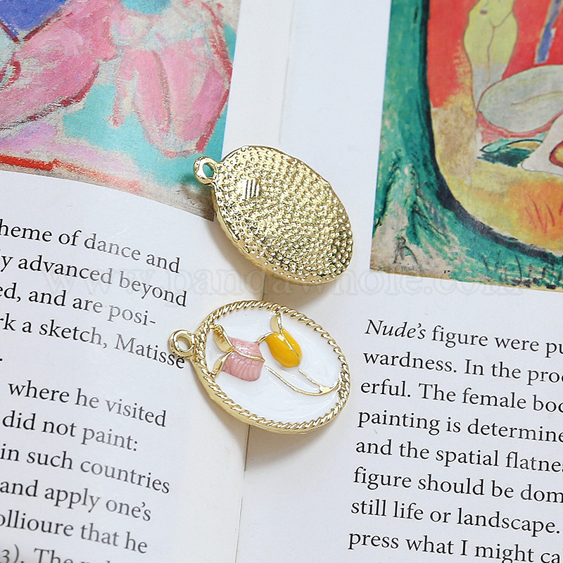 • Белый Подвески из эмали и сплава, золотые, овал с подвеской в виде тюльпана, белые, 30x21 мм