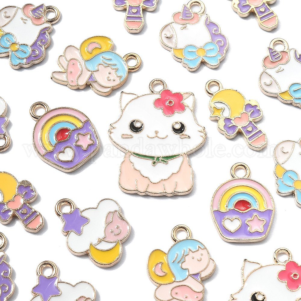 60 шт 6 стили подвески из сплава эмали, золотой свет, лунный крест/кот/единорог/радужный торт/облако/очарование девушки, без свинца и без кадмия