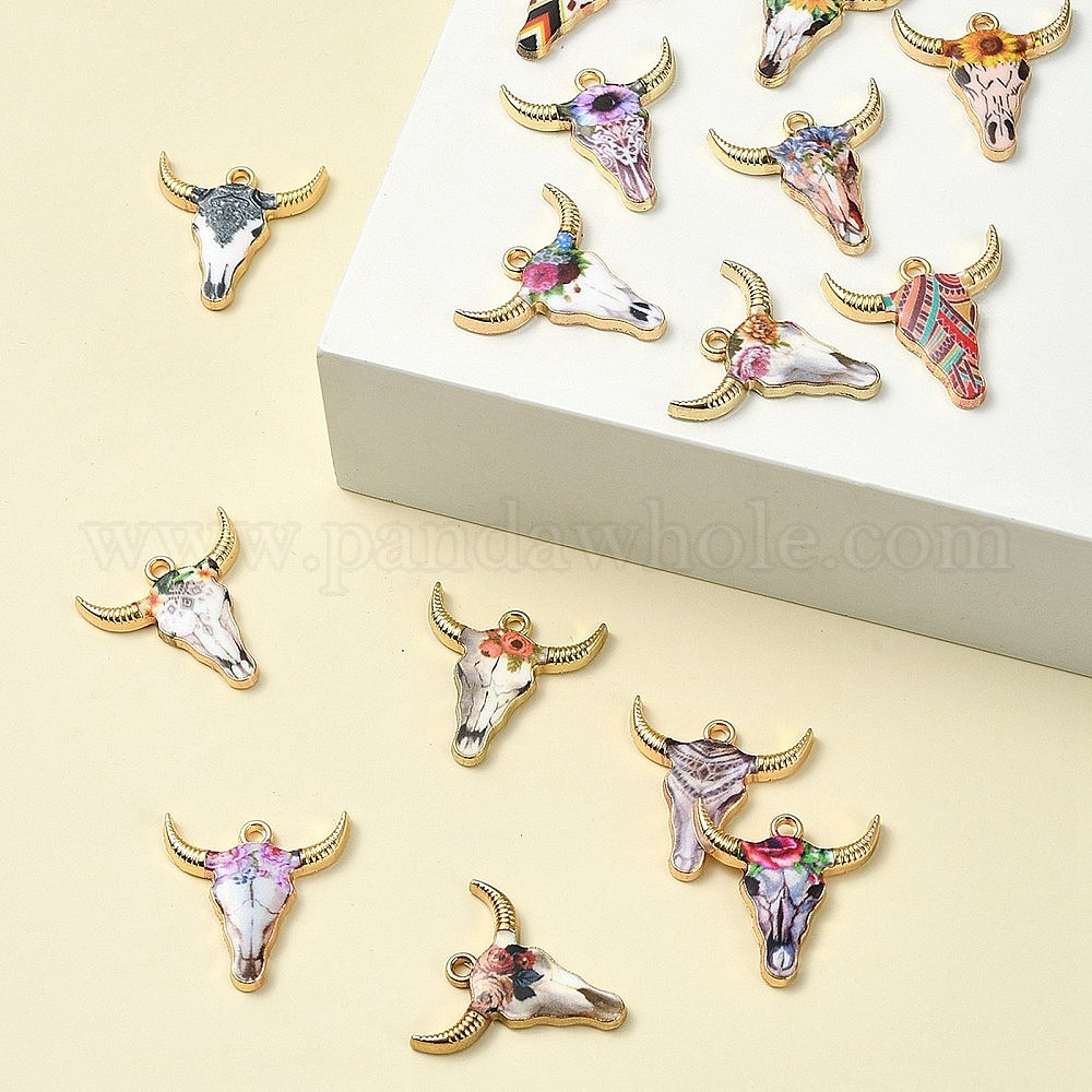 15 шт 15 стили подвески из цинкового сплава с эмалью, золотой свет, в форме головы быка с цветочным узором