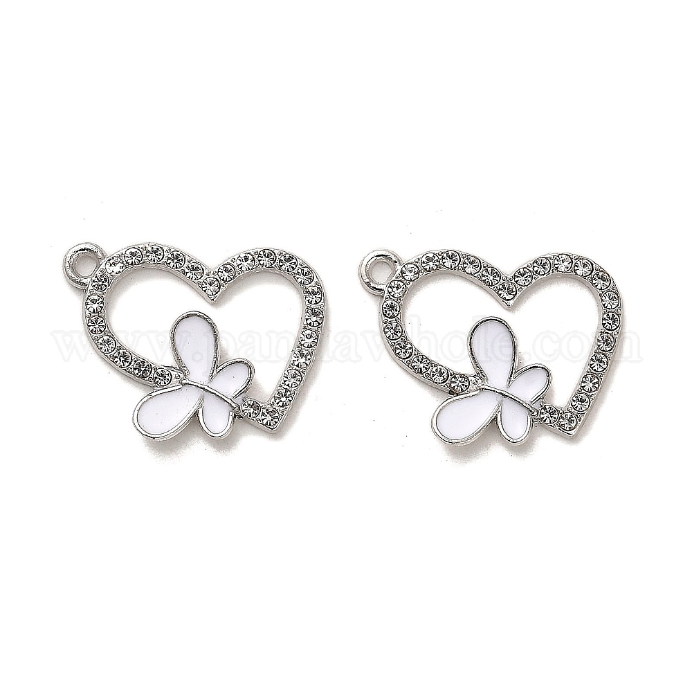 • Белый Подвески из эмали и сплава, с кристально горный хрусталь, платина, сердце с подвеской в виде бабочки, белые, 23x20x2 мм, отверстие : 1.5 мм