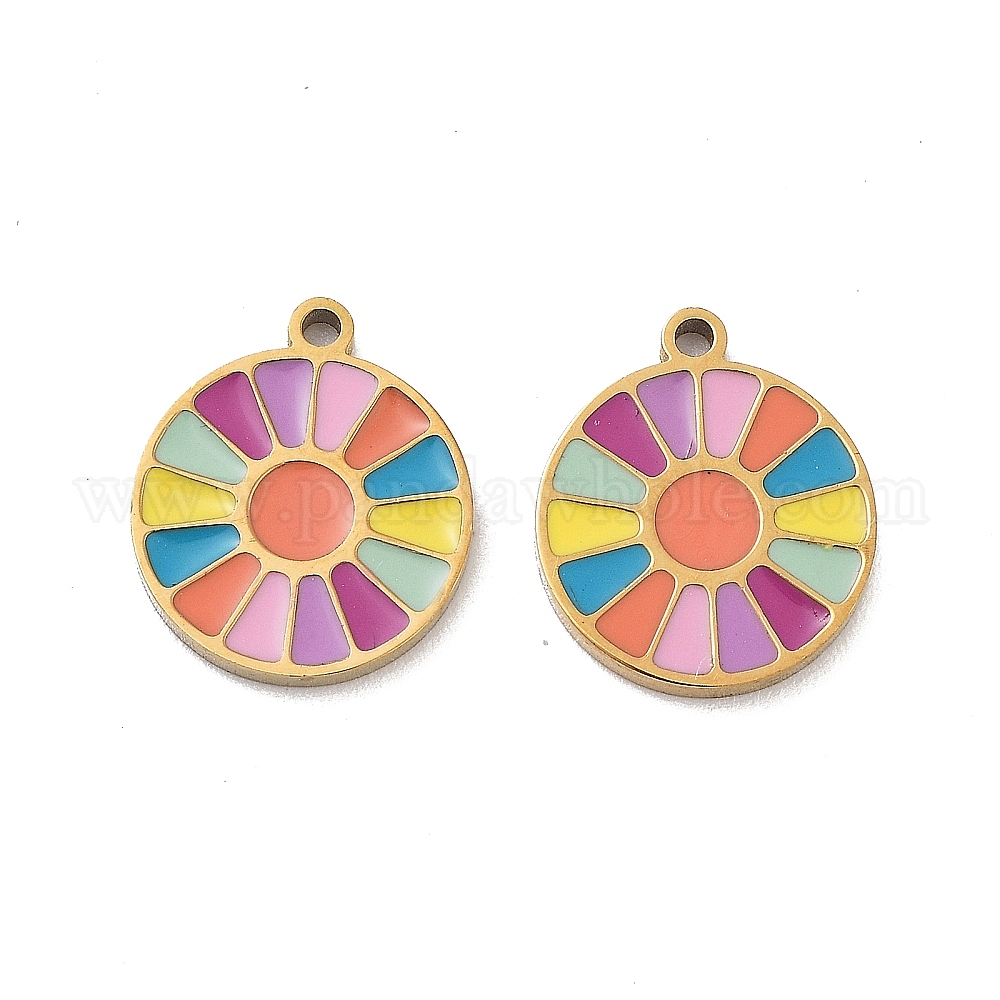 • Разноцветный Ионное покрытие (ip) 316 хирургические брелоки из нержавеющей стали, без никеля , с эмалью цвета радуги, плоские круглые прелести, реальный 18 k позолоченный, красочный, 11x10x1.5 мм, отверстие : 1 мм