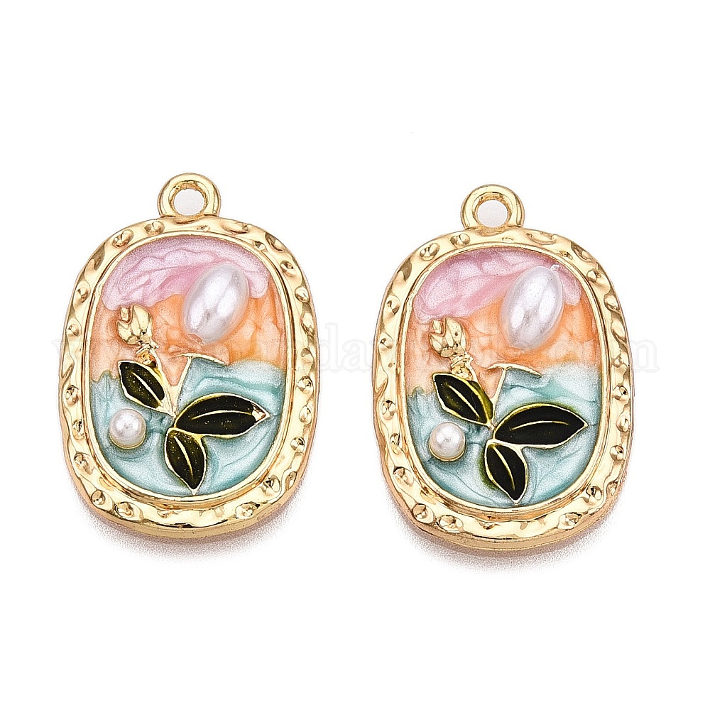 • Разноцветный Стойки обшивки сплава эмали подвески, с ABS имитации жемчуга, без кадмия, без никеля и без свинца, золотой свет, овал с подвеской в виде листьев, красочный, 26.5x17.5x5 мм, отверстие : 1.8 мм