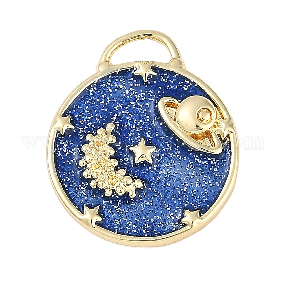 Латунь эмаль подвески, без кадмия, без никеля и без свинца, с блестками, реальный 18 k позолоченный, плоский круг с подвеской в виде планеты (02YA9T)