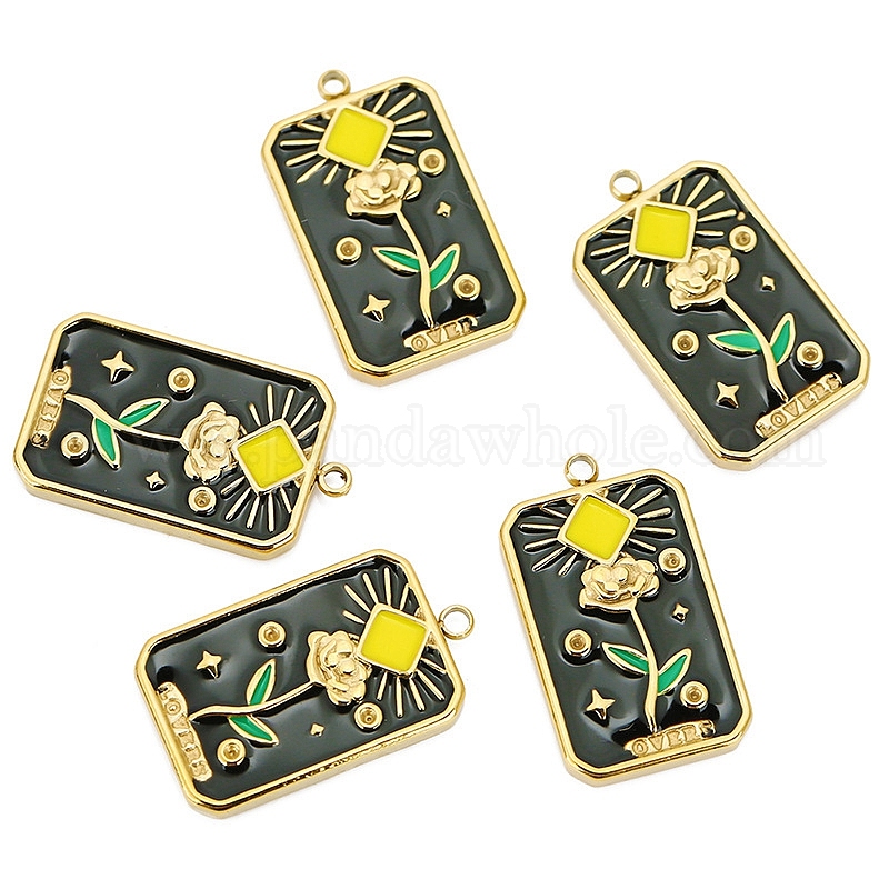 Шкентели нержавеющей стали, с эмалью, Прямоугольник с цветком, золотые