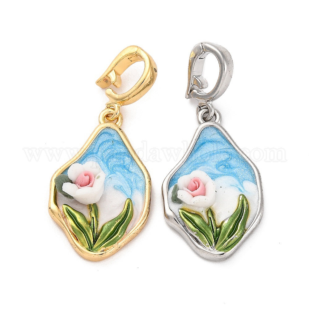 Латунь эмаль подвески, cmолой, без кадмия, без никеля и без свинца, неправильный овал с цветочным шармом