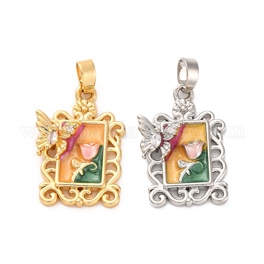 Латунь эмаль подвески, с четким кубического циркония, без кадмия, без никеля и без свинца, прямоугольник с подвеской в виде цветка и бабочки (02YHQ8)