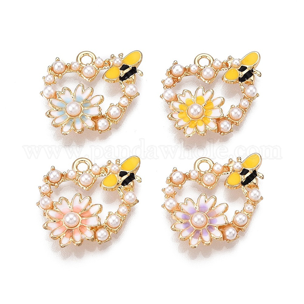 Стойки обшивки сплава эмали подвески, с ABS имитации жемчуга, без кадмия, без никеля и без свинца, золотой свет, подвеска в виде сердца с цветком и пчелой