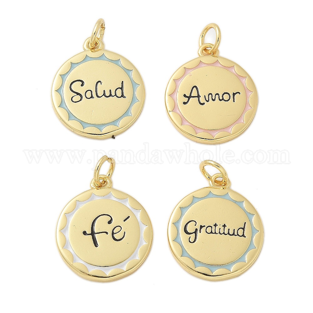Латунь эмаль подвески, с целью перехода в кольце, стойки покрытие, без кадмия и без свинца, долговечный, реальный 18 k позолоченный, плоский круг со словом fe/salud/gratitud/amor