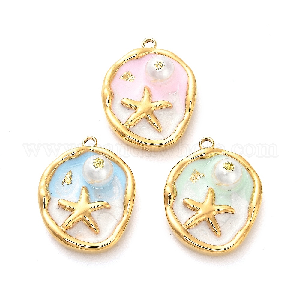 304 нержавеющей стальной эмали подвески, с блестящей пудрой и искусственным жемчугом, плоские круглые с морскими звездами, ионное покрытие (ip), реальный 18 k позолоченный