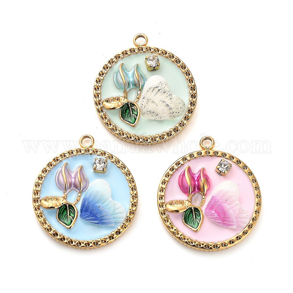 304 нержавеющей стальной эмали подвески, смолой и горный хрусталь, плоские круглые с цветком, ионное покрытие (ip), реальный 18 k позолоченный