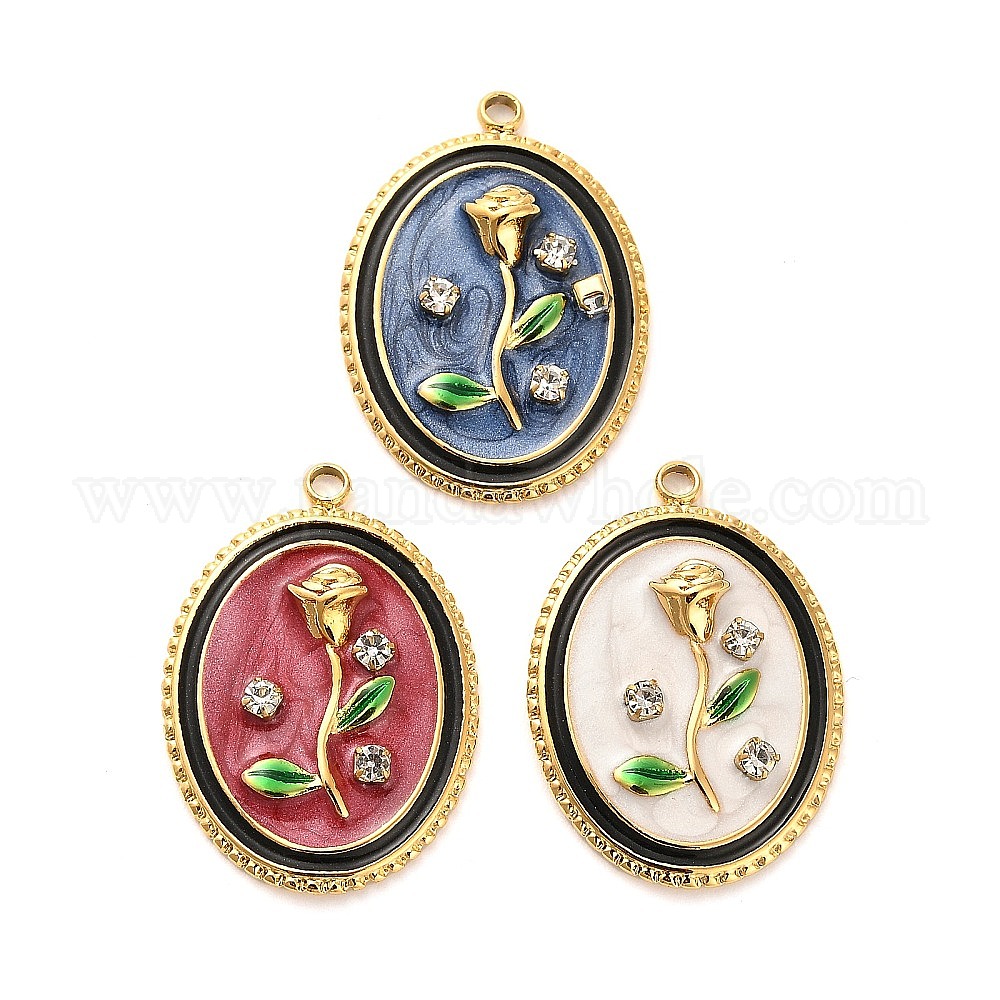 304 нержавеющей стальной эмали подвески, со стразами, овал с цветочными подвесками, ионное покрытие (ip), реальный 18 k позолоченный