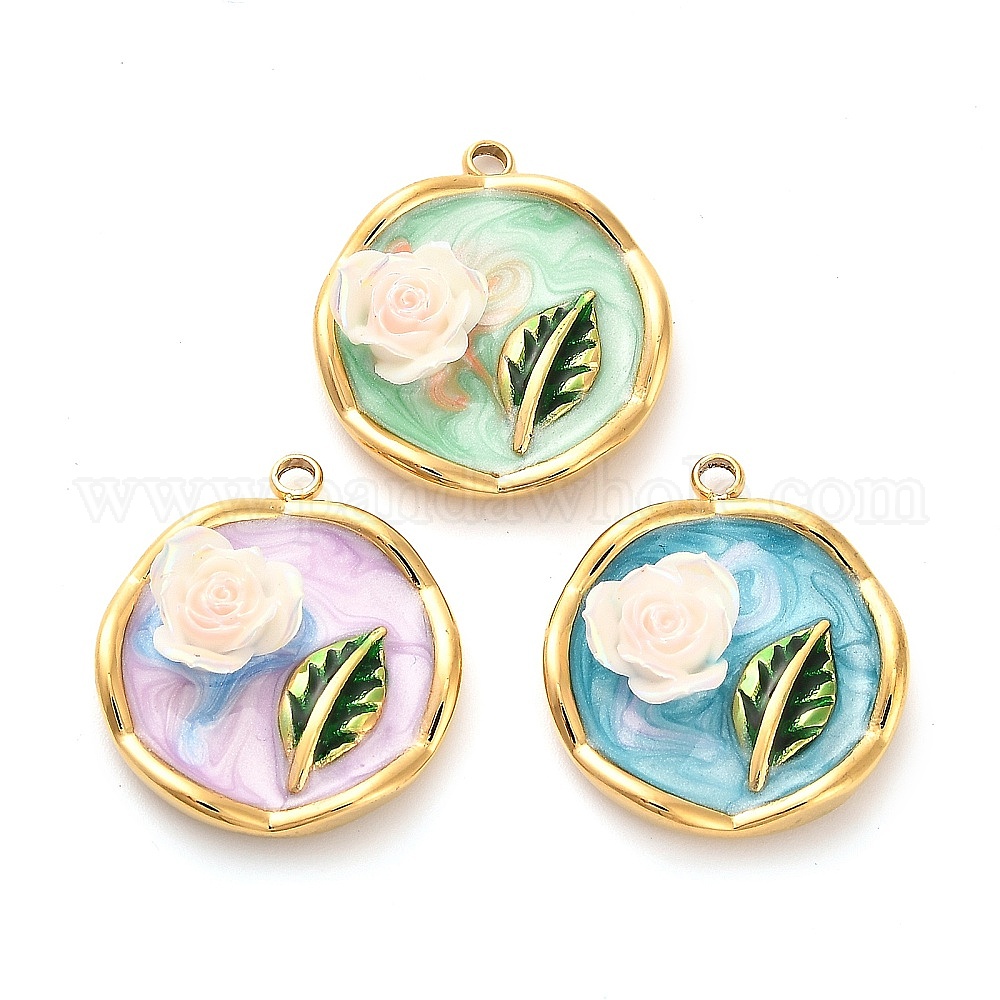 304 нержавеющей стальной эмали подвески, cmолой, плоские круглые с цветком, ионное покрытие (ip), реальный 18 k позолоченный