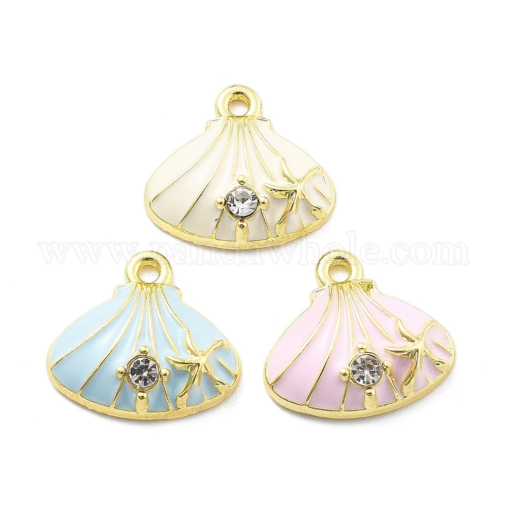• Pink Сплав эмали прелести, со стразами, шарм в форме ракушки, золотые, розовые, 13x14x4.5 мм, отверстие : 1.4 мм
