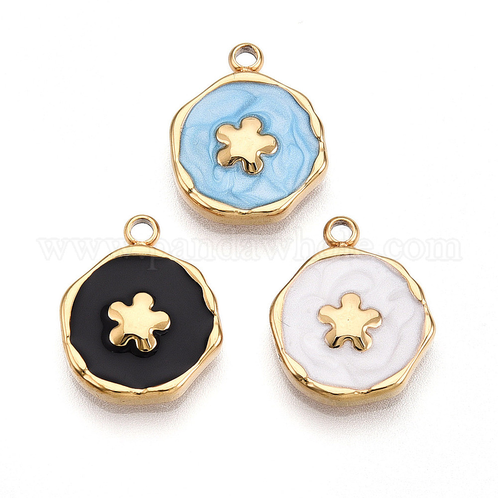 • Белый 304 подвески из нержавеющей стали, с эмалью, плоский круглый с цветными чарами, ионное покрытие (ip), реальный 18 k позолоченный, белые, 16x13x2.5 мм, отверстие : 1.6~1.8 мм