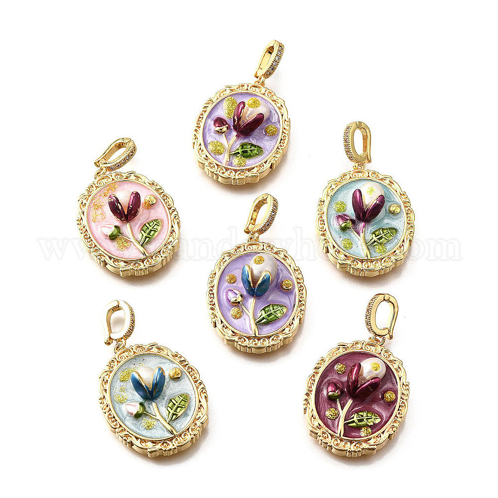 Латунные подвески с микропаве из кубического циркония и эмали, овал с цветочными подвесками, с блестящей пудрой и натуральным пресноводным жемчугом, реальный 18 k позолоченный