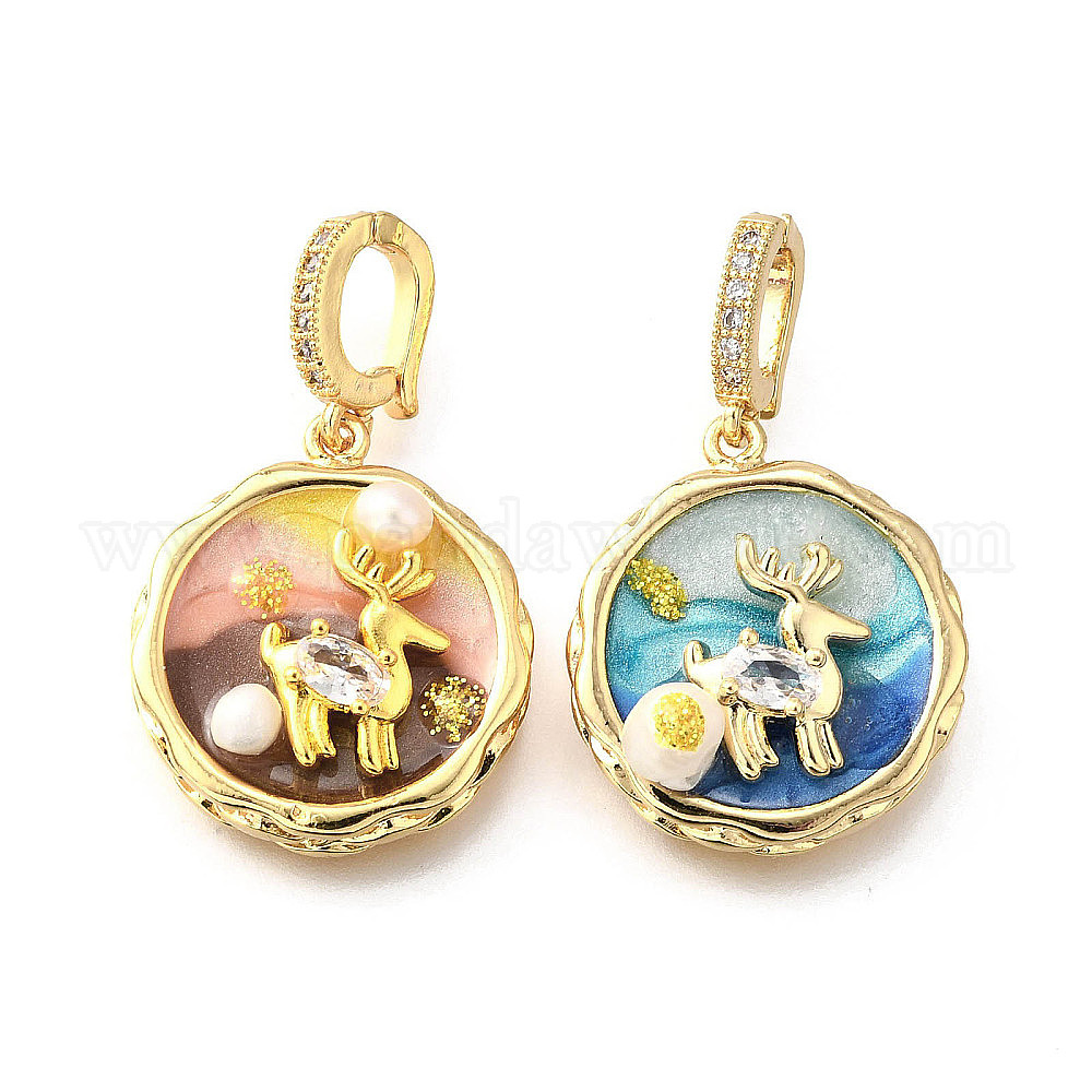 Латунные подвески с микропаве из кубического циркония и эмали, плоский круг с подвесками в виде лося, с блестящей пудрой и натуральным пресноводным жемчугом, реальный 18 k позолоченный