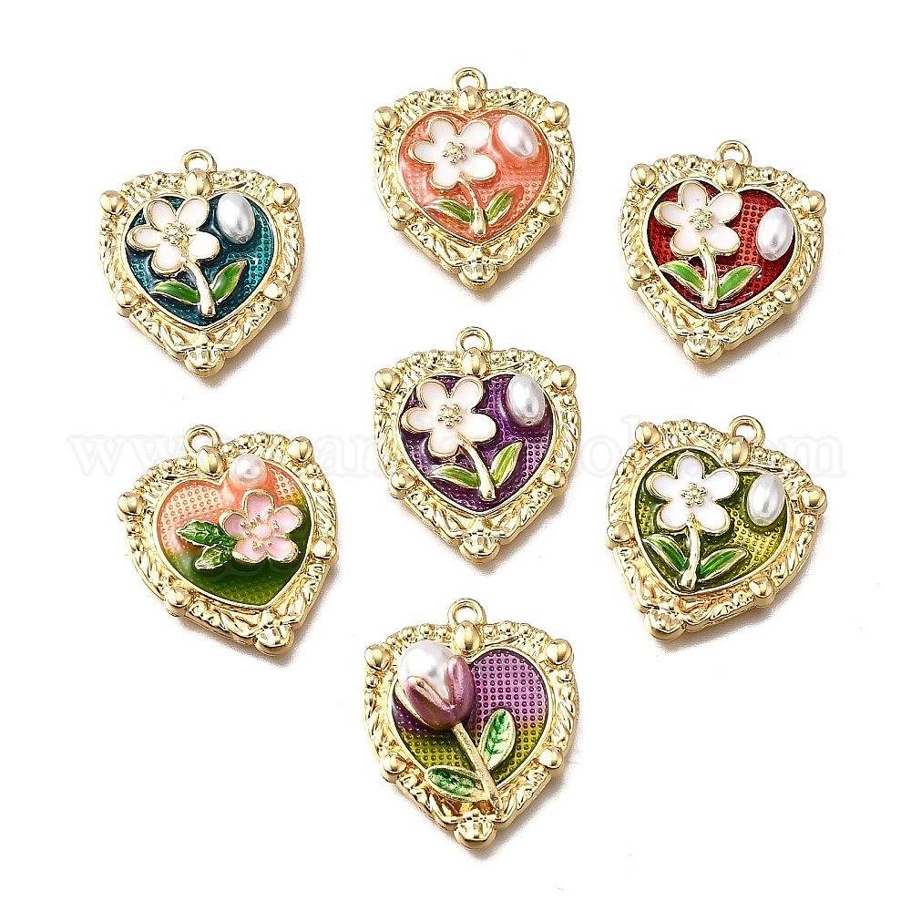 Подвески из эмали и сплава, с ABS имитации жемчуга, Сердце со цветками , стойки покрытие, долговечный, без свинца, без кадмии и без никеля, золотые