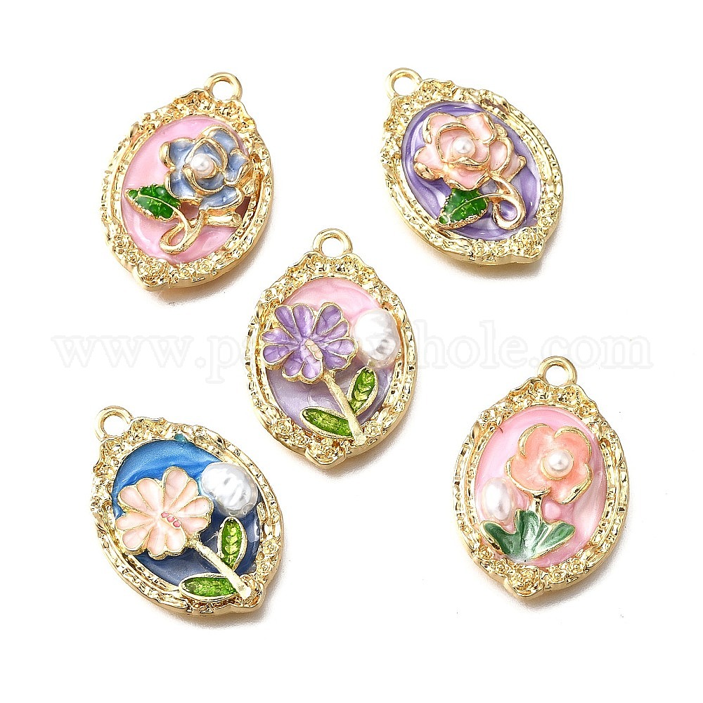 Подвески из эмали и сплава, с ABS имитации жемчуга, овальные с цветком, стойки покрытие, долговечный, без свинца, без кадмии и без никеля, золотые