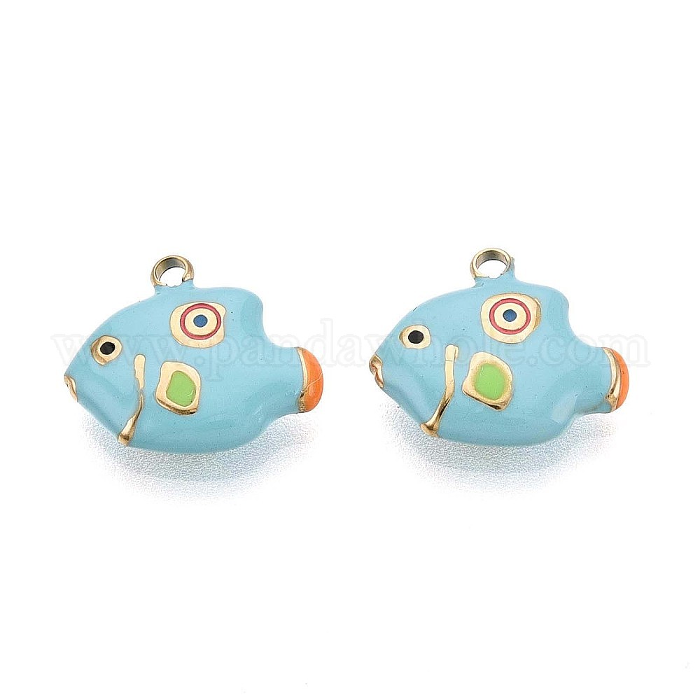 • Небесно-голубой 304 прелести нержавеющей стали, с эмалью, очарование рыбы, реальный 14 k позолоченный, голубой, 12x14x3.5 мм, отверстие : 1.5 мм