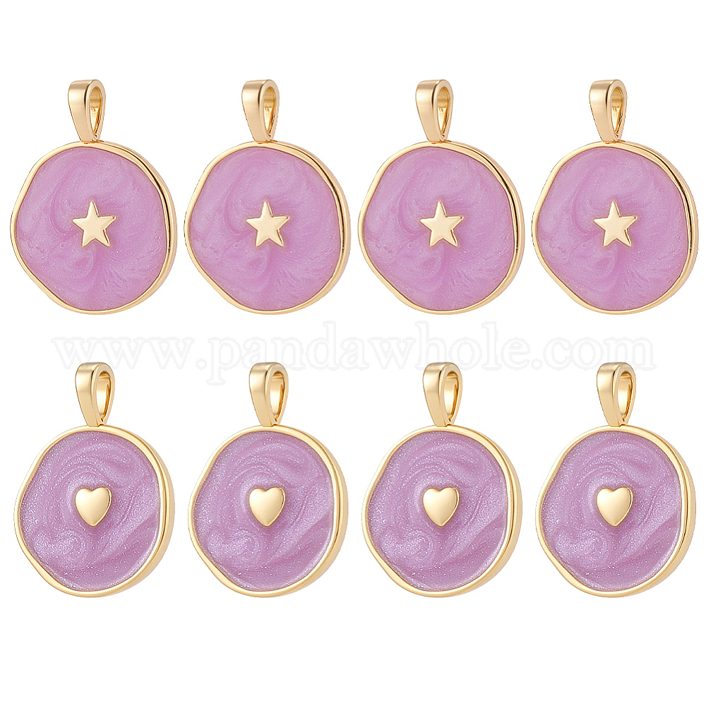 • Фиолетовый 8шт 2 стили латунные эмалевые подвески, Плоский круглый лист с узором из звезд и сердечек., реальный 16 k позолоченный, без кадмия, без никеля и без свинца, фиолетовые, 20.5x15.5x4.5 мм, отверстие : 2.5x3~3.5 мм, 4 шт / стиль