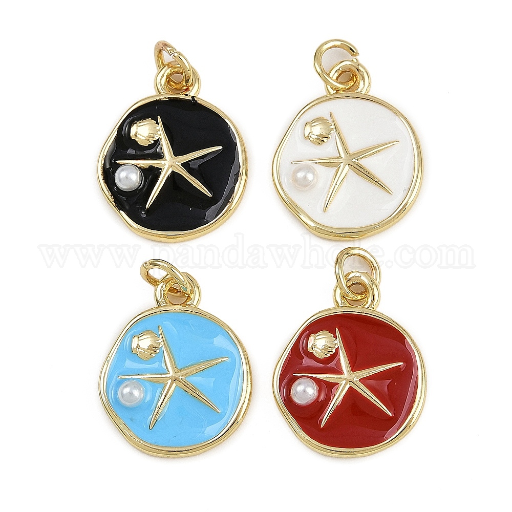 Латунь эмаль подвески, плоские круглые с морскими звездами, с абс пластмассовой имитационной жемчужиной, без кадмия и без свинца, реальный 18 k позолоченный, с целью перехода в кольце