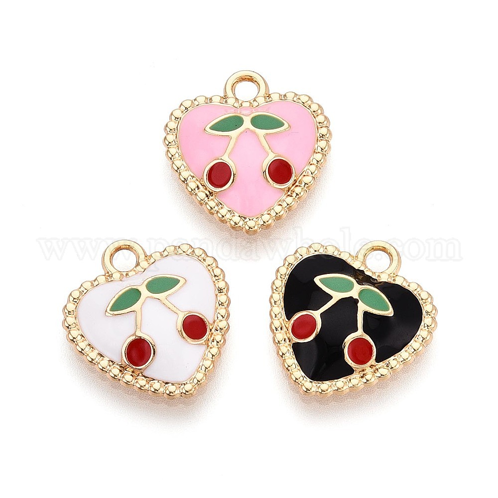 • Pink Подвески из эмали и сплава, сердце с вишневым шармом, золотые, розовые, 17x16x3.5 мм, отверстие : 2 мм
