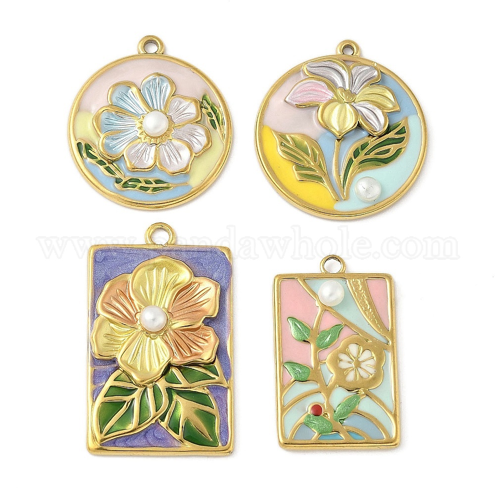 304 подвески из нержавеющей стали, цветок, с эмалью и жемчугом, реальный 18 k позолоченный, ионное покрытие (ip)