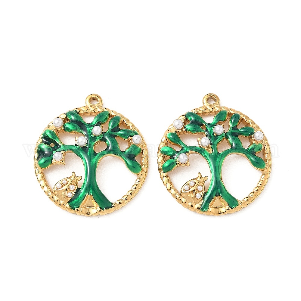 • Зеленый 304 нержавеющей стальной эмали подвески, с пластмассовой жемчужиной abs, дерево с насекомыми-талисманами, ионное покрытие (ip), реальный 18 k позолоченный, зелёные, 23x21x4 мм, отверстие : 1.2 мм
