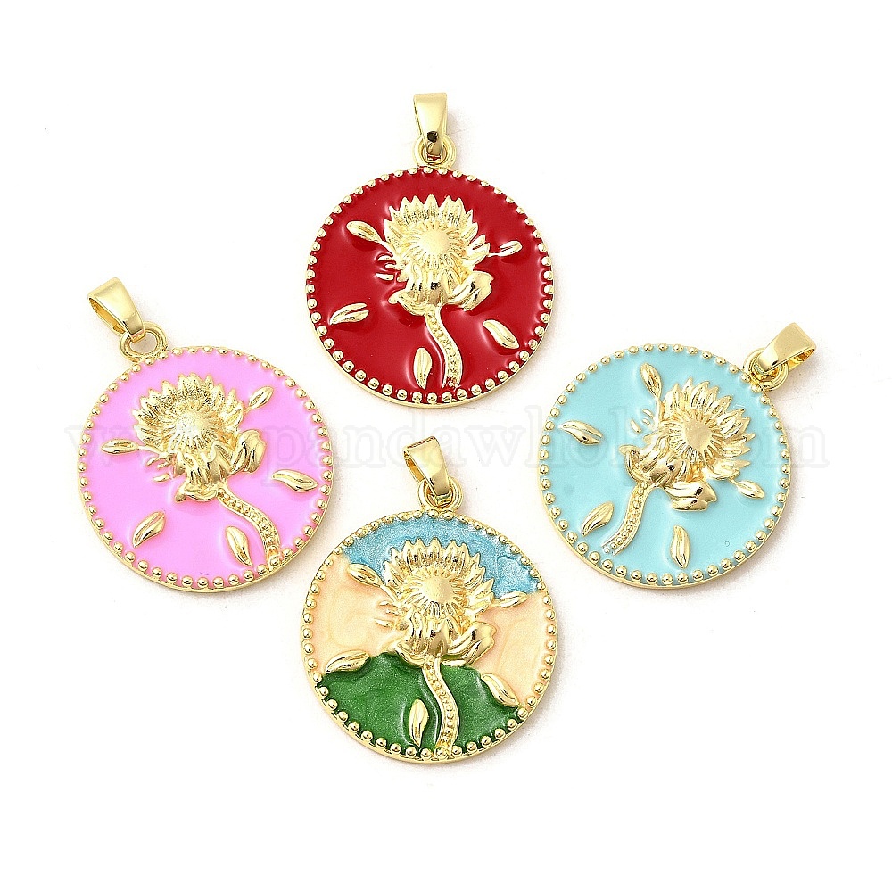 Латунь эмаль подвески, плоские круглые с цветком, без свинца и без кадмия, долговечный, стойки покрытие, реальный 18 k позолоченный