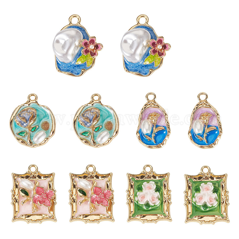 10 шт 5 стили подвески из сплава эмали, с имитацией АБС-жемчуга и блестящей пудрой, стойки покрытие, долговечный, без свинца, без кадмии и без никеля, золотые, разнообразные