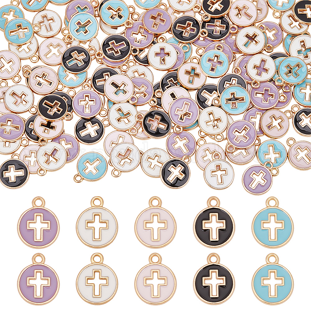 120 шт 5 цвета позолоченные подвески из сплава с эмалью, плоские круглые с крестом