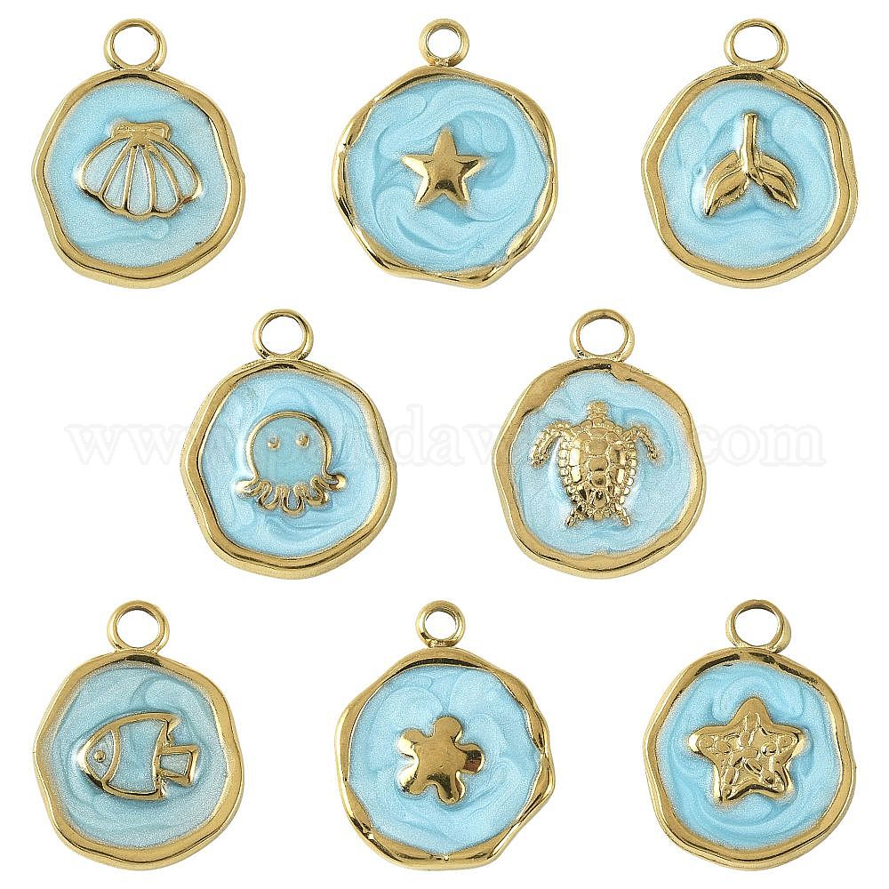 • Светло-Голубой 8 шт. 8 стили: морские животные 304 подвески из нержавеющей стали, с эмалью, плоские круглые прелести, ионное покрытие (ip), Небесно-голубой, 16.5x12.5~13x2~2.5 мм, отверстие : 1.6~2.5 мм, 1 шт / стиль