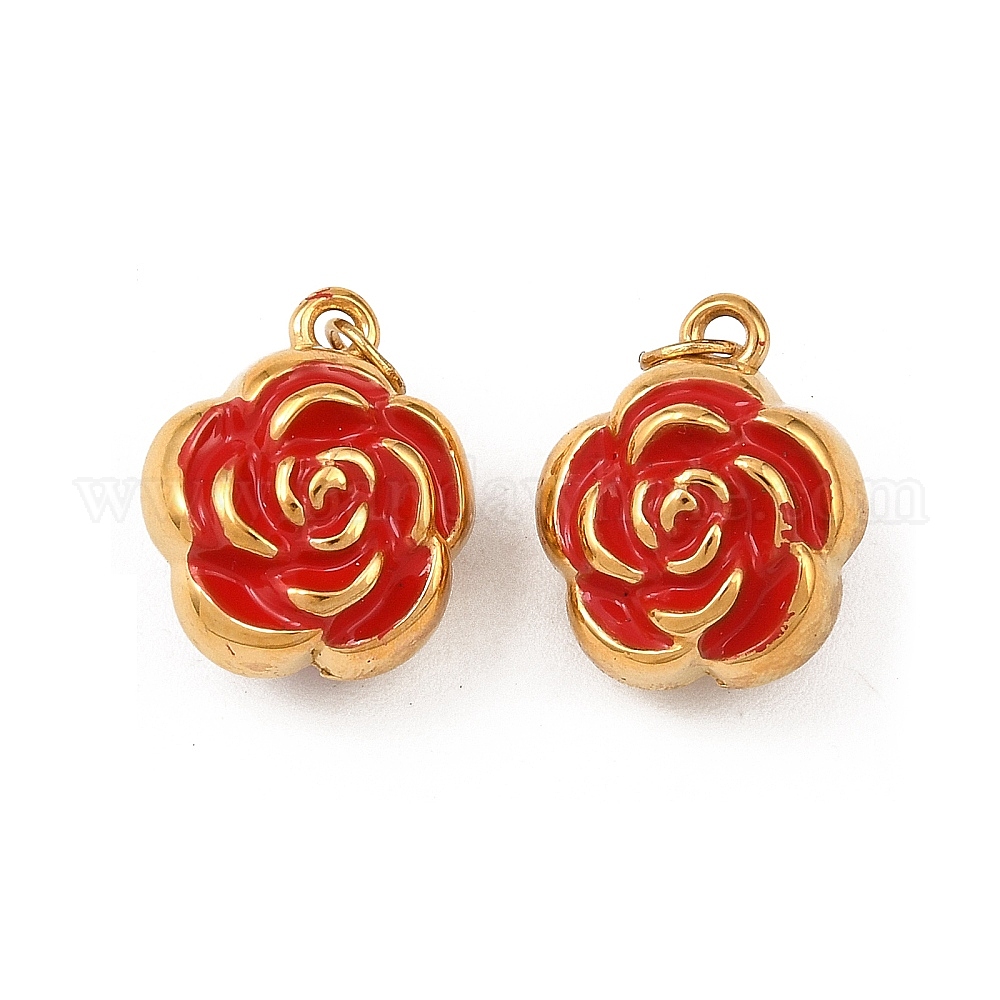 • Красный 304 из нержавеющей стали шармы эмали, роза, ионное покрытие (ip), реальный 18 k позолоченный, с целью перехода в кольце, красные, 14x12x9 мм, отверстие : 3 мм
