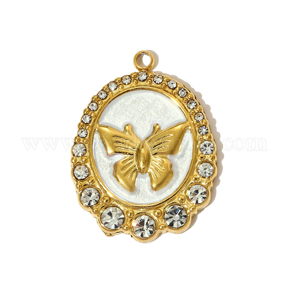 304 нержавеющей стальной эмали подвески, овал с подвесками в виде бабочек, с блестящей пудрой и стразами, ионное покрытие (ip), реальный 18 k позолоченный