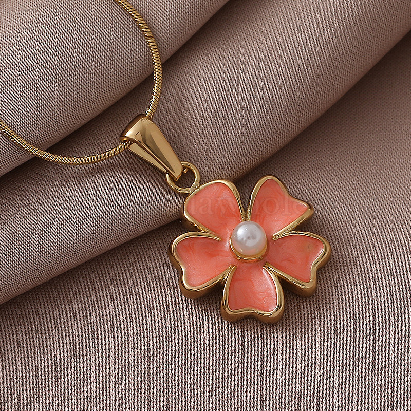 • Коралловый 304 нержавеющей стальной эмали подвески, цветочные подвески с искусственным жемчугом, золотые, коралл, 22x18 мм