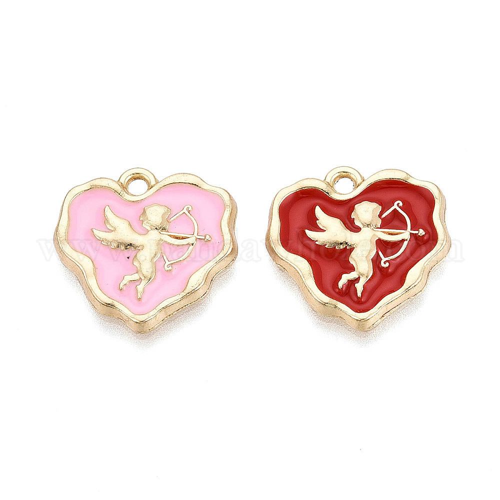 • Pink Подвески из эмали и сплава, Сердце с подвесками в виде ангела и феи., золотые, без кадмия, без никеля и без свинца, розовые, 18x18x2.5 мм, отверстие : 1.8 мм