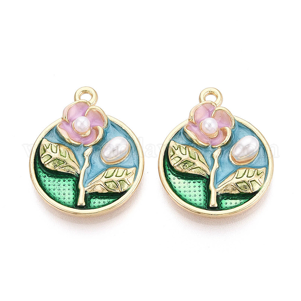 Подвески из эмали, АБС-пластика и искусственного жемчуга с гальваническим покрытием., плоский круглый с цветными чарами, без кадмия, без никеля и без свинца, золотые