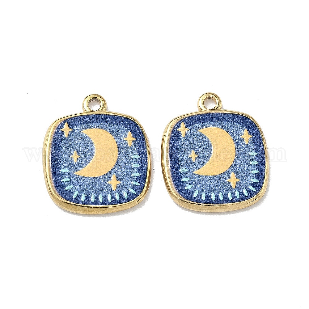 • Настоящее золото 18K 304 нержавеющей стальной эмали подвески, квадрат с подвесками в виде луны, ионное покрытие (ip), реальный 18 k позолоченный, 21.5x18.5x2.5 мм, отверстие : 1.8 мм