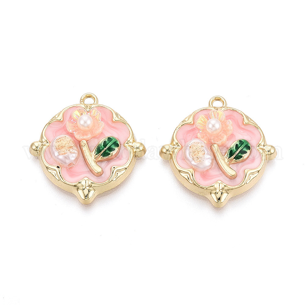 Подвески из эмали, АБС-пластика, искусственного жемчуга и акриловой блестящей пудры с гальваническим покрытием., плоские круглые и цветочные подвески, золотые, без кадмия, без никеля и без свинца