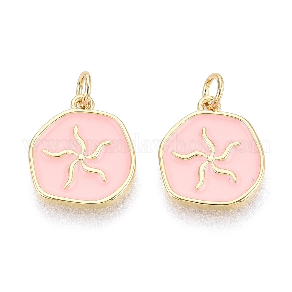 • Розовый Латунь эмаль подвески, самородки с цветочными подвесками, реальный 16 k позолоченный, туманная роза, 16x14x1.7 мм, отверстие : 3 мм, Перейти кольцо: 5x0.8 мм, внутренний диаметр: 3 мм