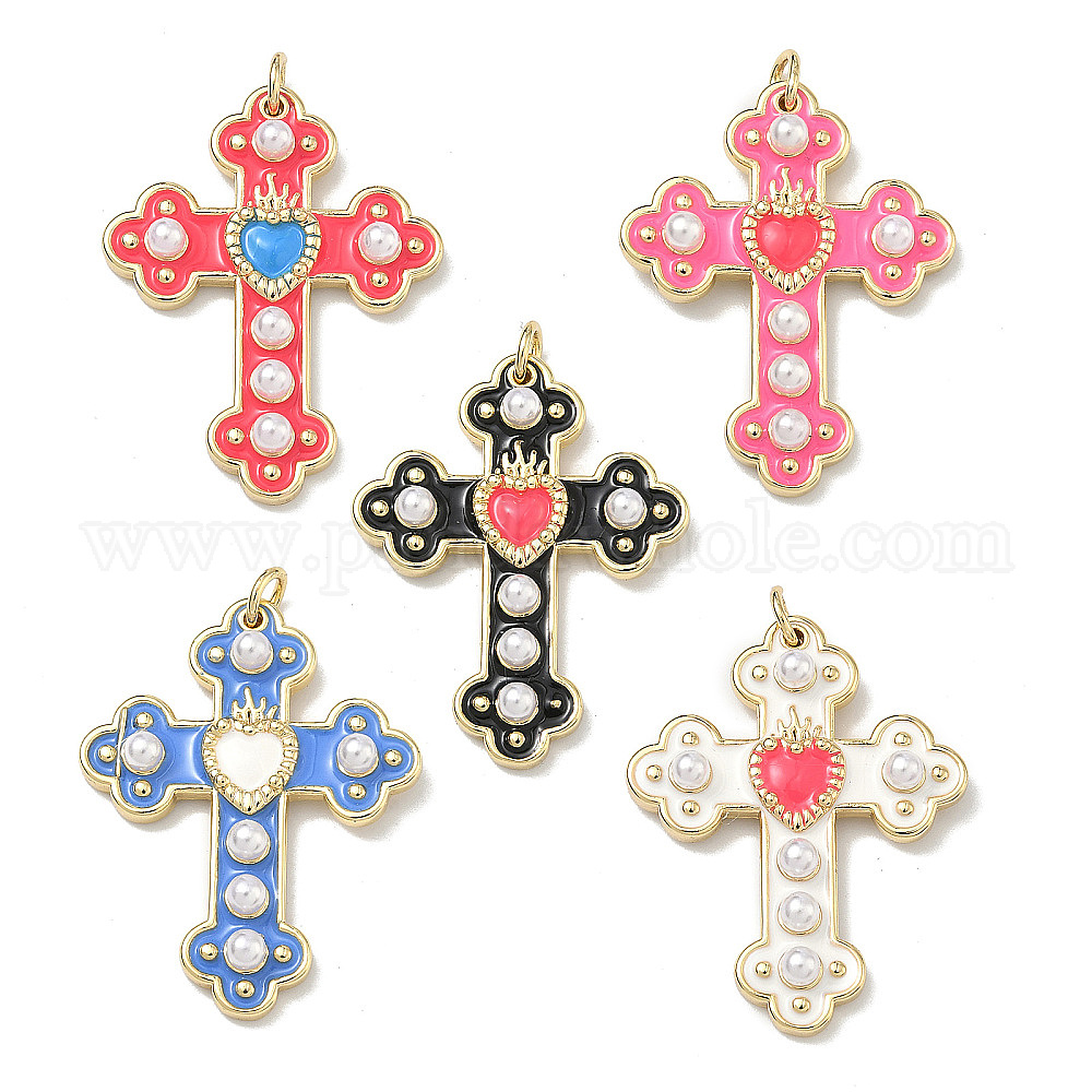 Подвески из латуни с эмалью и имитацией жемчуга из АБС-пластика., крест прелести, долговечный, без кадмия и без свинца, стойки покрытие, реальный 18 k позолоченный