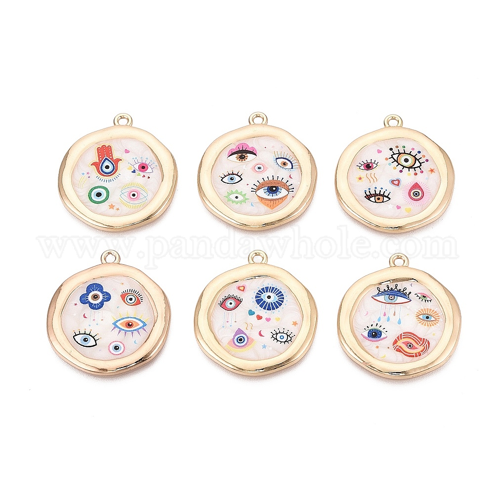 • Разноцветный Печатные эмали подвески сплава, плоские круглые амулеты, амулеты от сглаза и НЛО, стойки покрытие, без кадмия и без свинца и без никеля, золотые, красочный, 33x30x2~3 мм, отверстие : 2 мм