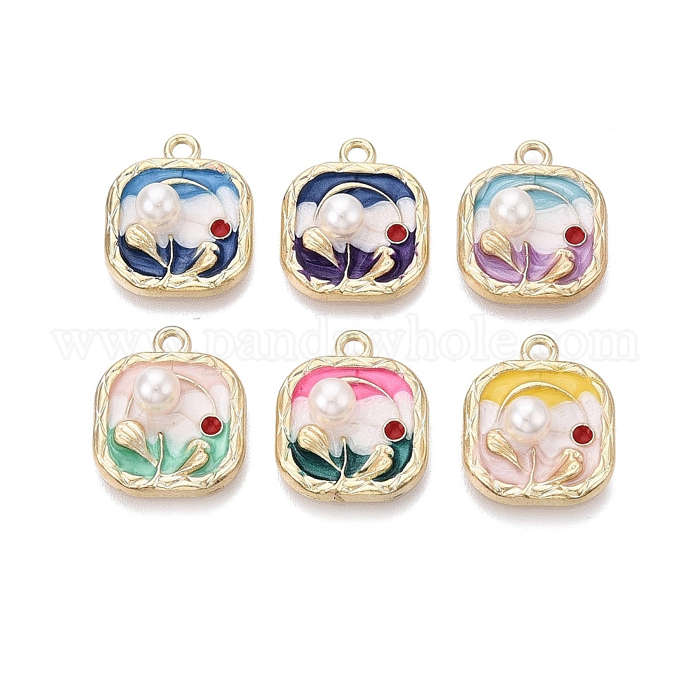 • (52) Непрозрачная лаванда Подвески из эмали и сплава, квадратные и цветочные подвески, с ABS имитации жемчуга, золотой свет, разноцветные, 19x16x6 мм, отверстие : 1.8 мм