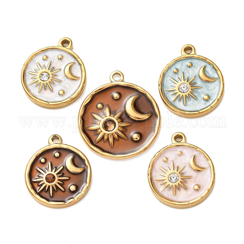 304 подвески из нержавеющей стали, с эмалью и горный хрусталь, плоские круглые подвески и подвески в виде солнца и луны, реальный 18 k позолоченный, ионное покрытие (ip)