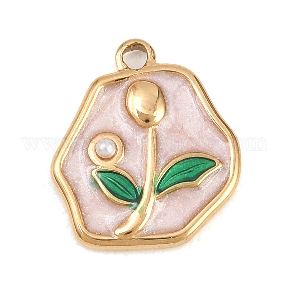 • Золотой 304 Подвески из нержавеющей стали с эмалью и пластиковыми жемчужинами, подвески-самородки с цветочным узором, золотые, золотые, 15.5x13.5x3 мм, отверстие : 1.5 мм