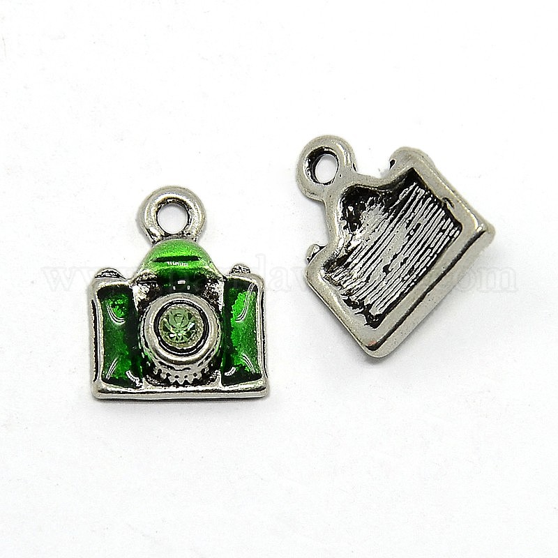 • Зеленый Камеры античный серебряный тон эмали сплава прелести, со стразами, зелёные, 15x12x6 мм, отверстие : 1.5 мм