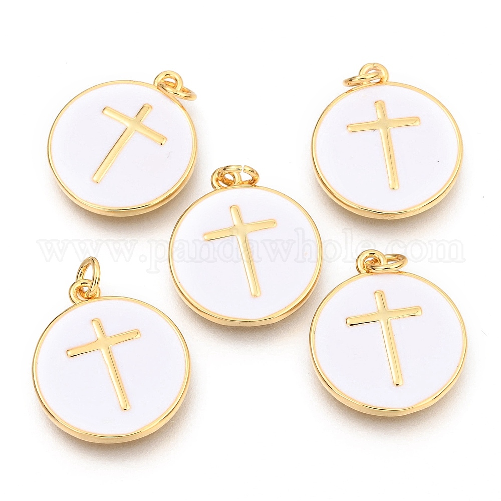 Латунь эмаль подвески, долговечный, реальный 18 k позолоченный, с прыжковых колец, плоские круглые с крестом
