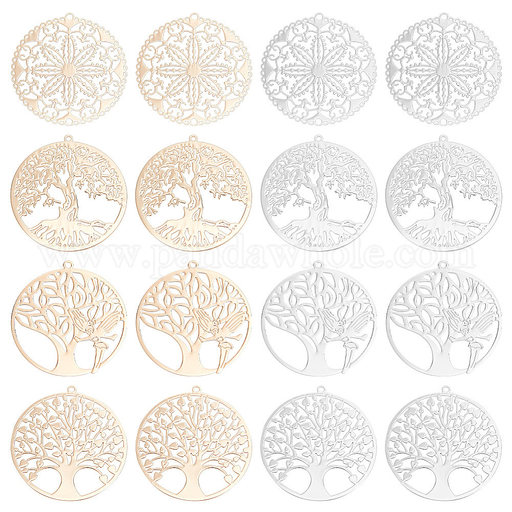 32шт 8 стиль стойка покрытие латунные филигранные подвески, долговечный, плоско-круглые, без никеля , плоская круглая с деревом жизни, ангелом и цветком